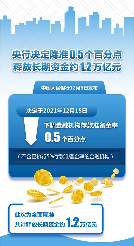 新華社北京12月6日電(記者吳雨)中國人民銀行6日宣布,決定于2021年12月15日下調金融機構存款準備金率0.5個百分點(不含已執行5%存款準備金率的金融機構)。此次為全面降準,共計釋放長期資金約1.2萬億元。