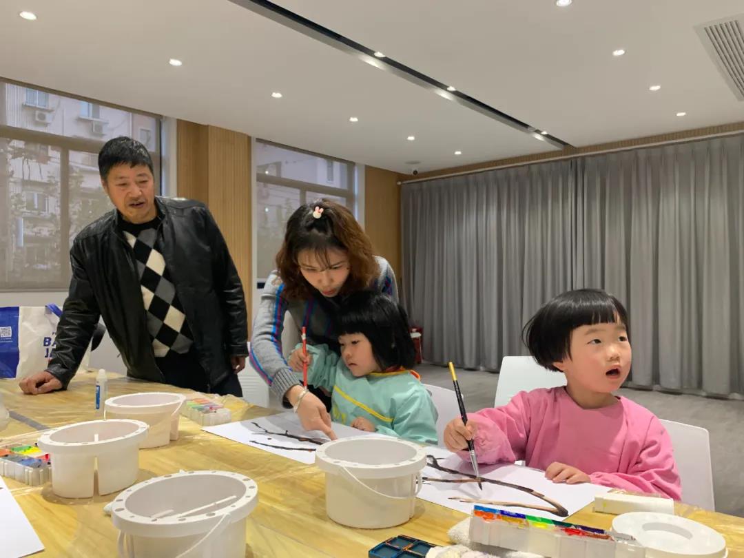 肆點伴空間不僅僅有圖書區。在入口左手邊的門后,還有一間活動室。當天下午,活動室里迎來了四對親子家庭。一到現場,大家就熟門熟路地忙活起來,搬桌椅,擦黑板,扯桌布,分顏料,幾分鐘過去,原本空蕩蕩的活動室變成了一間微型繪畫教室。四個孩子在桌邊依次坐好,面前攤著幾張白紙和繪畫材料,繪畫老師劉老師也來了。今天,他們的繪畫主題是:樹干上的鳥巢。