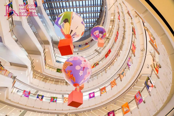 來到商場室內,只見中庭上方高高掛起了熱氣球,地面上還有超大幅的絢麗壁畫,“都市童話世界”般的長寧來福士,一步一景。