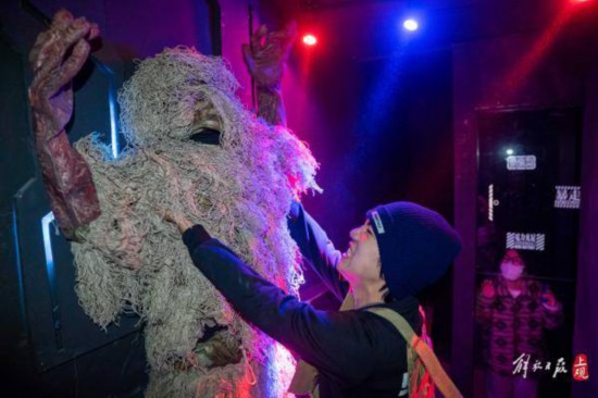 密室劇目《光株》中,NPC表演“軍官”和”長毛怪“激烈打斗。 孟雨涵 攝