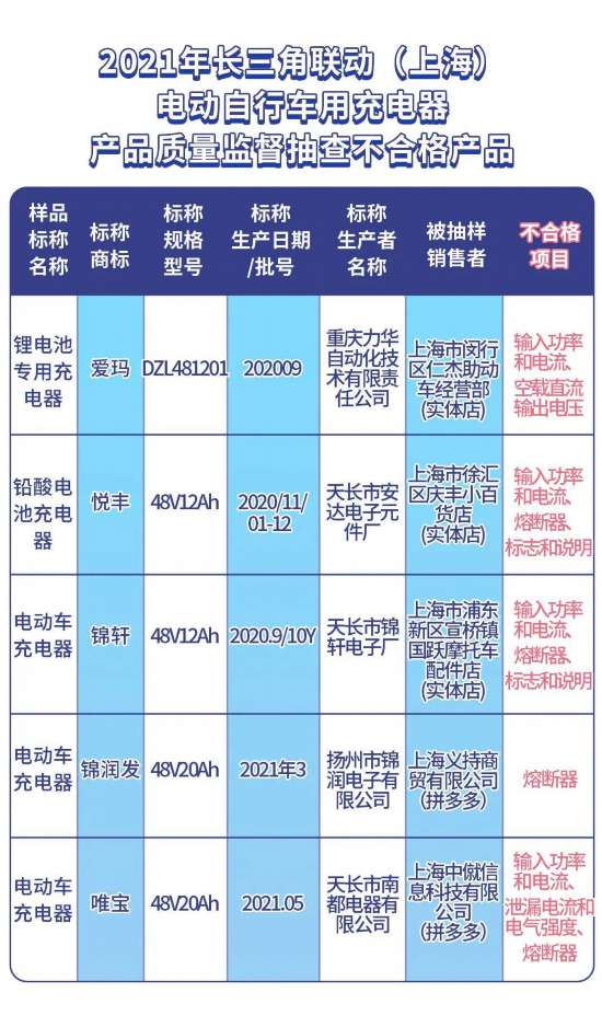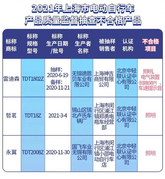 上海市市場監管局對本市生產、銷售的電動自行車、電動自行車用充電器和電動自行車鋰離子電池55批次產品進行了產品質量監督抽查,共發現不合格產品9批次。其中電動自行車20批次中3批次不合格,電動自行車用充電器25批次中5批次不合格,電動自行車鋰離子電池10批次中1批次不合格。詳見↓