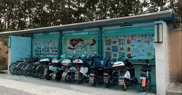除了為電動車充電,這里還是一個便民服務角和文化宣傳陣地。車棚一角設置了便民服務箱,社區居民自發捐贈了維修工具、針線包以及雨傘等用具,為車棚注入了溫暖活力。為了補齊小區文化陣地缺少的短板,車棚墻面還設計美化了三塊宣傳欄,新涇發展歷史、新涇非遺文化、居民喜聞樂見的社區故事等通過宣傳版面呈現了出來。