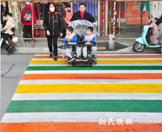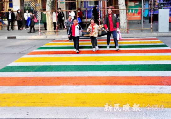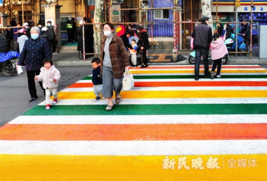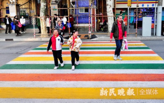 黃浦區制造局路上近日出現了本市首條“彩虹斑馬線”,這條集合了橙、黃、綠、粉等顏色的斑馬線,色彩斑斕,遠遠望去仿佛一條鋪設在路面上的彩虹。彩虹斑馬線讓小朋友在學會遵守規則時,增添了美的教育。而凡是經過這里的車輛,總會自覺減慢車速、禮讓行人。行人也被這條頗具識別度的人行橫道吸引,減少了在外行走和隨意斜穿的概率。彩虹斑馬線成了周邊幼兒園、小學校孩子們的過街安全線。