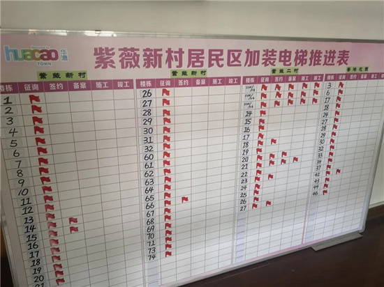 其次,以紫薇新村為例,在社區黨總支指組織下組建了由居委、業委、物業組成的“加梯工作專班”,僅用一個月時間就完成了小區2400戶既有多層住宅中初步符合加裝條件的180個樓組的全覆蓋征詢調查和加梯可行性評估排摸,并在此數據基礎上,梳理制定了涵蓋樓棟、征詢、簽約、備案、施工和竣工6個階段的加裝電梯推進表,讓小區內所有有加梯需求的居民對加梯工作流程的每一步都心中有數,這份加梯表也開啟了小區加梯的加速度。