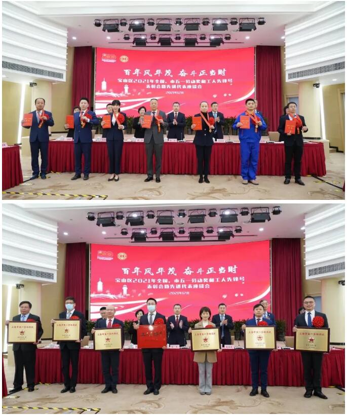 表彰會上,領導們為獲得全國工人先鋒號、上海市五一勞動獎狀、上海市五一勞動獎章、上海市工人先鋒號的先進集體代表和個人頒獎。