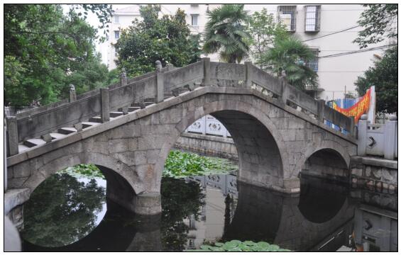 “曹楊環浜南端的堤壩處繼續向東走,走過一個健身場地,讓人感覺逐漸遠離馬路的喧鬧,再走進兩座月亮型的洞門,門口裝有‘防君子’的鐵門(平時不上鎖,沒有人看守),進入鐵門后,看看居民樓的門牌,知道這里是曹楊三村。南面因有一條環浜,給小區的環境添色不少!幽靜的氛圍中眼前出現一座在城市中難得一見的石拱橋橫跨在曹楊環浜上,不時橋上走過一些老人,好像把人帶到了‘久遠的年代’,別有洞天的感覺,油然而生!橋上有橋名,但沒有建造年份,據路過此橋的一位老媽媽說,是1957年建造,但從網上查找不到該橋的信息。走過‘桂香橋’,在南岸又見到一座民國時期的碉堡,與前面的碉堡的直線相距約2-30米,這里原來是一個碉堡群。像這樣的碉堡,在一些居民區里經常能發現一些!隆隆炮火聲的一頁已經翻過,我們應該從這些留下的歷史的記憶符號中深思,我們更應該珍惜來之不易的和平環境!”