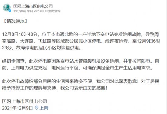 【新民晚報·新民網】據國網上海市區供電公司官方微博披露,12月8日18時48分,位于本市通北路的一座半地下變電站突發跳閘故障,導致周家嘴路、大連路、飛虹路等區域部分居民小區停電。經連夜搶修,至12月9日6時23分,故障停電的居民小區均恢復供電。