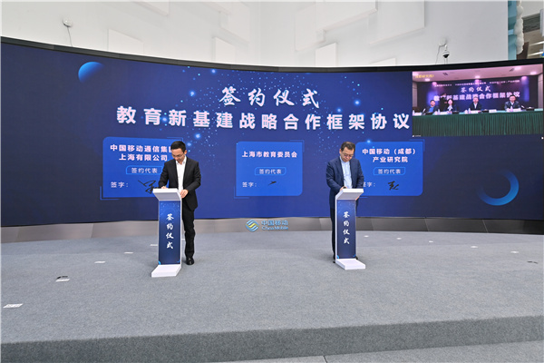 此次發布會上,市教委、上海移動、中國移動(成都)產業研究院共同簽署《教育新基建戰略合作協議》,三方攜手,加快上海教育新基建,推進上海教育數字化轉型發展。根據協議,三方將重點圍繞“教育新基建”“新基建領域產學研合作”等方面展開深入合作,助力上海教育領域形成一批高質量、可復制、可推廣的教育數字化轉型經驗和示范場景,擘畫教育數字化轉型藍圖。