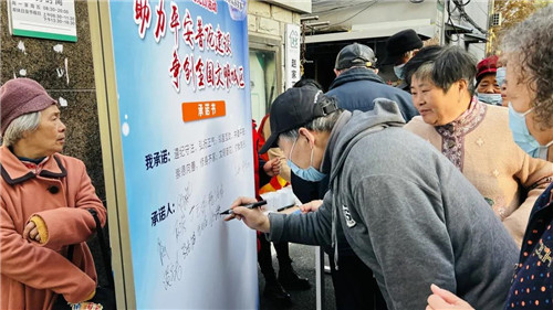 在居委會門前,一塊“助力平安普陀建設 爭創全國文明城區”的宣傳展板引起了過往居民的注意,志愿者們引導居民以親筆簽名的方式,作出“遵紀守法,弘揚正氣;鄰里互動,共建平安;崇德向善,修身齊家;文明普陀,你我同行”的承諾。