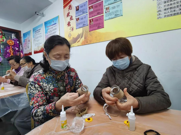 在新天地河濱花園的居委會里,不起眼的廢棄玻璃瓶經過麻繩、蕾絲帶、花朵的點綴瞬間脫胎換骨,成為了別具清新風的裝飾品。在綠植老師的指導下,居民小心翼翼地將梔子花、吉利紅兩種綠植移栽到玻璃瓶中,一瓶賞心悅目的水培綠植便躍然眼前。