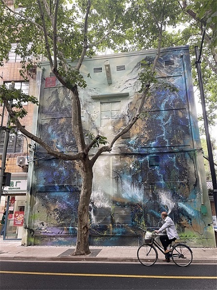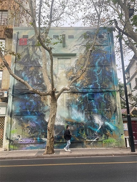 初夏,作品完成,墻體繪畫和梧桐在視覺上相映相融,梧桐樹葉構成的光影斑駁,為街區增添雅趣。