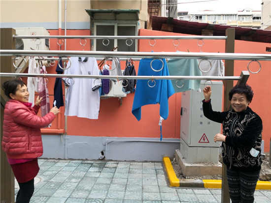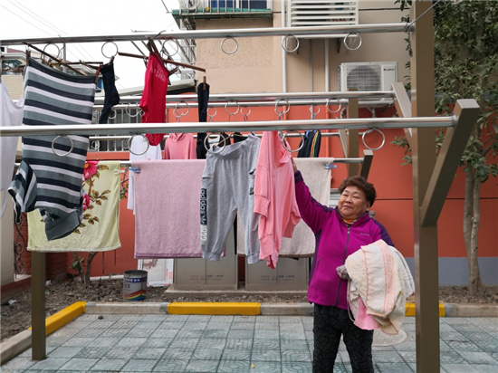 “我家住2樓,以前晾衣服要從窗臺撐竹竿出去。一不當心,衣服就會落到底樓。年紀大了,撐棉被掌握不好平衡,總擔心蹌個跟頭!眲⒁陶f:“小區建了這個晾曬點,我早上起來第一件事就是下樓晾衣裳,這里日照辰光長,衣裳曬得透。太陽下曬曬背,和老鄰居講講閑話,心情也好起來!
