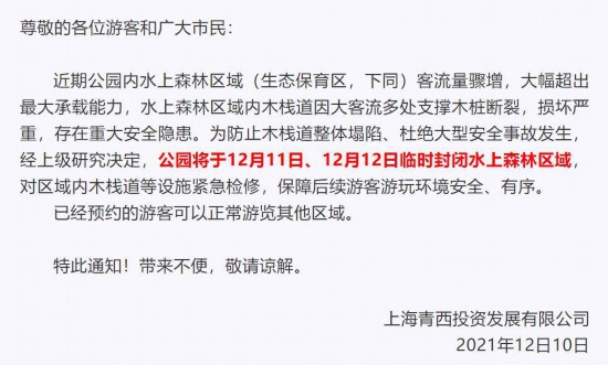 東方網記者柏可林12月13日報道:正是賞秋好時節,每逢周末,上海的各大郊野公園都迎來不少游客。三天前,青西郊野公園水上森林區域(生態保育區)就因為客流量驟增,大幅超出最大承載能力,導致木棧道多處支撐木樁斷裂,損壞嚴重,不得不臨時封閉水上森林區域進行緊急檢修。截至目前,申城共有八大郊野公園,郊野公園游客承載量要如何確定?如何強化公共服務?《上海市郊野公園運營管理指導意見》近日印發,提出了一些細化要求。