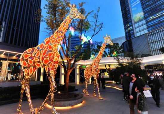 新亮相的“今潮8弄”已成為滬上的新晉網紅打卡點。而不少市民選擇在傍晚時分游覽新潮8弄,更有一種穿越時空的感覺。夜幕下的石庫門建筑在燈光的映襯下,外墻的肌理和原貌更清晰可見,廣場上的長頸鹿等動物燈景在夜幕下繽紛炫彩,各種時尚攤點擺滿街面,讓潮流地標更有時尚風情與海派文化交融的魅力。