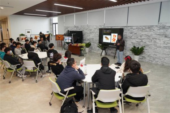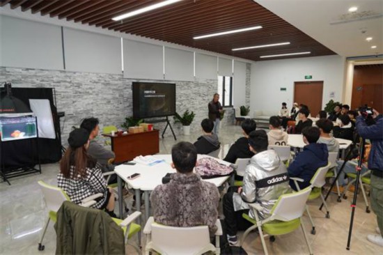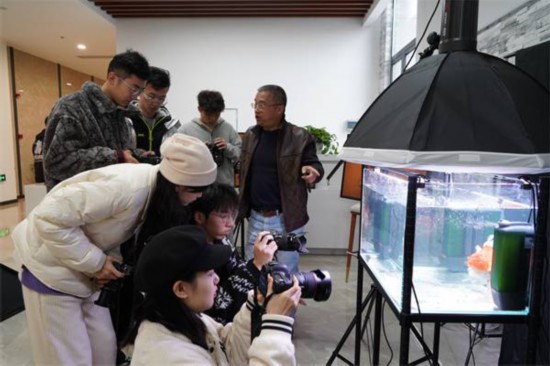 “普通人重在養,門道深的人重在文。咱們水族專業也是很‘講究’美的!”為了上好這堂課,何為課前布置好了一個水族箱,還在墻壁上掛了金魚掛畫,方便同學們近距離甚至“零距離”觀察。除了水族專業的同學,學生攝影協會的同學也慕名而來。何為在課上分享金魚的習性,并在此基礎上給大家講解拍攝金魚的技巧,鼓勵大家“動起來”。