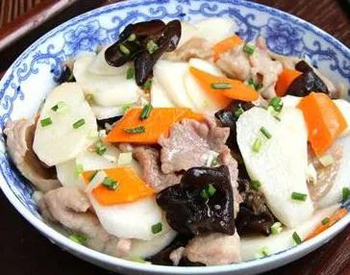 山藥木耳肉片:口感質地柔軟,山藥健脾益胃、益肺止咳、降低血糖,木耳可防治缺鐵性貧血和血栓癥。