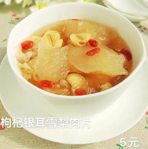 枸杞銀耳雪梨肉片:銀耳與雪梨都是潤肺能手,清爽微甜的口感消減了肉片的膩味。此道菜具有潤肺補腎、生津明目、清熱化痰,滋補健體之效。