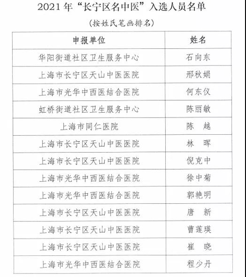長寧區天山中醫醫院倪克中獲得“長寧區名中醫(杏林名家)”榮譽稱號,華陽街道社區衛生服務中心石向東等12名醫生入選“長寧區名中醫”,予以掛牌成立“長寧區名中醫工作室”。