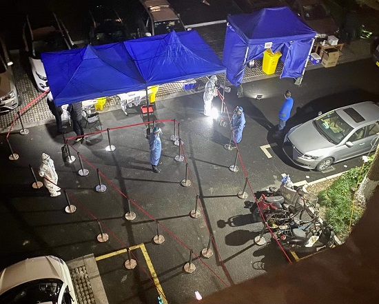 換好衣服,步行下樓。從窗外望下去,樓門口的空地上已經搭起三頂藍色帳篷,穿著防護服的工作人員戴著口罩、面罩,在警戒線四周站立著。