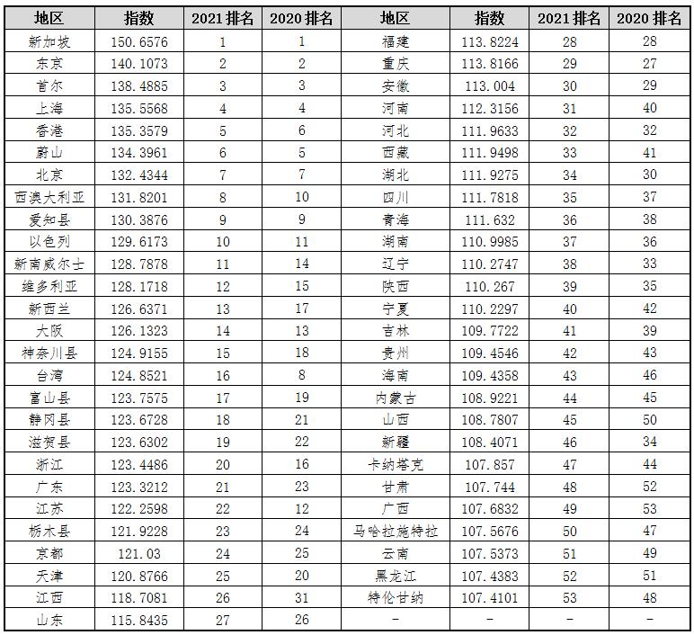 該指數對亞太53個地區用19項指標進行評估,綜合反映了各地區將知識資本轉化為經濟價值和居民財富的能力。和去年相同,排名前三位的分別是新加坡、東京、首爾。