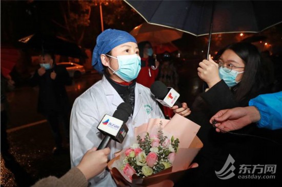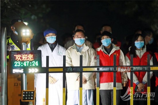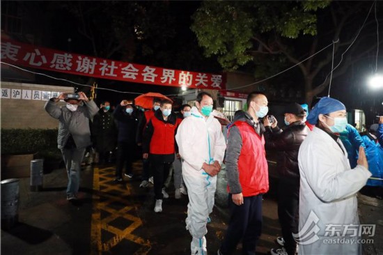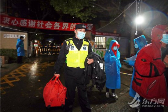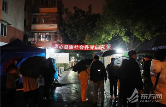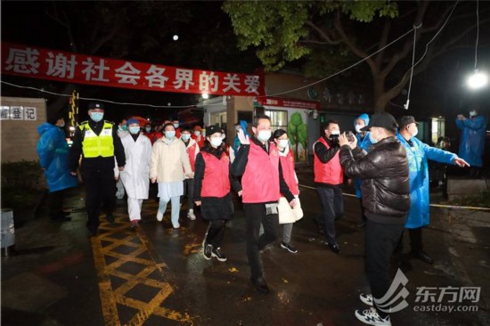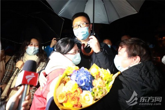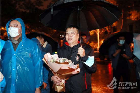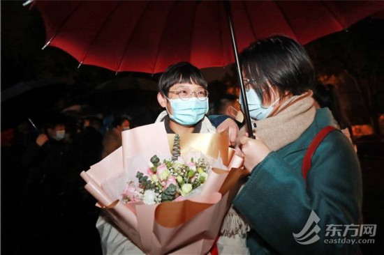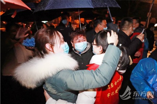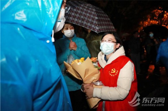 12月16日零點,牡丹路186弄小區準時打開大門,過去14天里“逆行”進入小區的民警、醫護人員、社區工作者圓滿完成保障任務,在雨中離開小區。門外,家人、朋友和同事們等候多時,將鮮花獻給配合疫情防控的居民和最美“逆行者”。雖然夜雨中的空氣有些寒冷,但現場氣氛熱烈而溫暖。