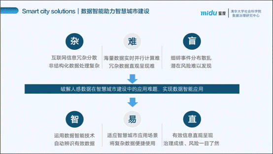 上海蜜度信息技術有限公司首席分析師、微熱點研究院副院長高威則表示,以新媒體大數據為代表的“人感數據”雖然在政務領域有一定的應用基礎,是了解民情民意、感受市民情緒的有利工具,但囿于數據龐雜、非結構化數據處理難度大、細碎事件中不易呈現趨勢性判斷等原因,其在智慧城市建設中的應用并不充分;而與清華大學社會科學學院的合作則成功推動了“人感數據”在社會治理、城市治理和決策輔助領域的理論提升和應用研究。據高威介紹,蜜度之前推出的“城感通”(城市治理及公共決策風險防范感知系統)就是在雙方產學研合作基礎上的應用成果之一,目前已在國內多個省、市、區智慧城市相關項目中落地應用,推進了智慧城市的模式迭代。依托最新研究成果,“城感通”也實現了2.0版本的迭代升級。新版本的“城感通”運用數據智能技術自動辨識有效數據,適應智慧城市應用場景,實現了復雜數據便捷使用、有效信息直觀呈現,令治理效果和潛在風險一目了然,破解了“人感數據”在智慧城市建設中的應用難題,實現了數據的智能應用。