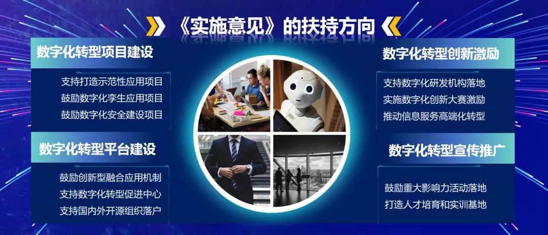 具體而言,《實施意見》將從項目建設、創新激勵、平臺搭建、宣傳推廣四個方向對創新企業予以支持。在項目建設方面,支持以“跨領域、融數據、可推廣”為標志的數字化轉型項目,打造一批應用場景標桿;在創新激勵方面,引導數字化研發機構落地、實施數字化創新大賽激勵、推動信息服務高端化轉型,吸引數字化高端產業集聚;在平臺搭建方面,鼓勵創新型融合應用機制、支持行業數字化轉型促進中心和國內外開源組織落戶,搭建數字化產業孵化平臺;在宣傳推廣方面,推動重大活動舉辦并落地普陀、打造人才培育和實訓基地,營造數字化轉型良好氛圍。