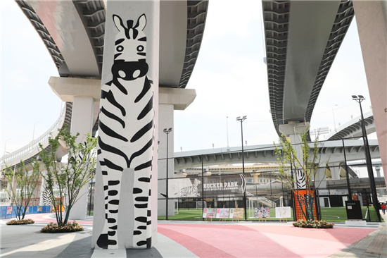 最近,“老司機們”開車駛過上海中環北虹立交橋下,都眼前一亮:原本“撂荒”的空地,鋪裝了藍色球場和紅色跑道,灰色橋柱“跳上”幾只粉紅的火烈鳥、黃色的獵豹和黑白相間的斑馬,敞亮、活潑又時尚。