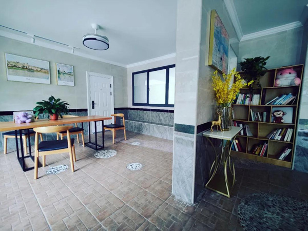“這里進來寬敞又明亮,里面長長的卡座大家都喜歡坐著喝喝茶、聊聊天,或者書架上拿本書讀,很舒服。這個桌子是我們大家的‘餐廳’,有時候每家做個菜,我們就在這里聚餐!闭驹16號樓的樓道會客廳里,記者完全想象不到,此前居民口中的樓道是“堆滿了廢棄自行車,經常有流浪貓狗,進樓道一股味道……”