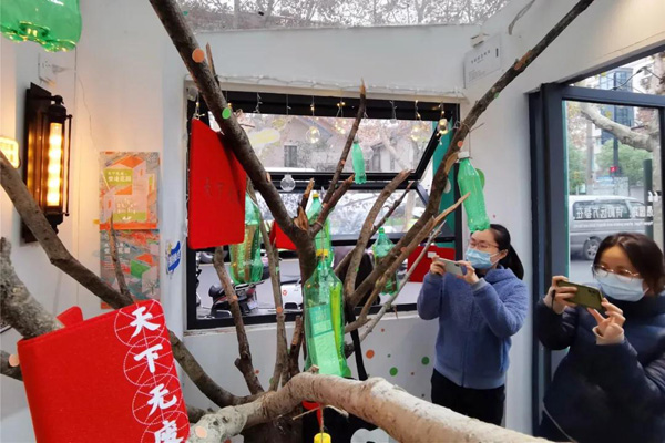 展廳入口處的“許愿樹”用愚園路上廢棄的樹干拼接而成,枝干上掛滿了由塑料飲料瓶改造而成的“許愿瓶”,在瓶中可以找到許多觀展者的感慨卡片和美好祝愿。