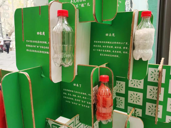 樹上還掛著不少可持續理念的產物,包括8個飲料瓶做成的“在乎包”和“在乎衛衣”以及24個飲料瓶回收制作而成的“24包”等。據介紹,回收塑料瓶經過專業加工可形成顆粒、絲線和布料,加入創意理念后制成的創意周邊深受大家喜愛,也讓低碳環保的可持續發展理念更加深入人心。