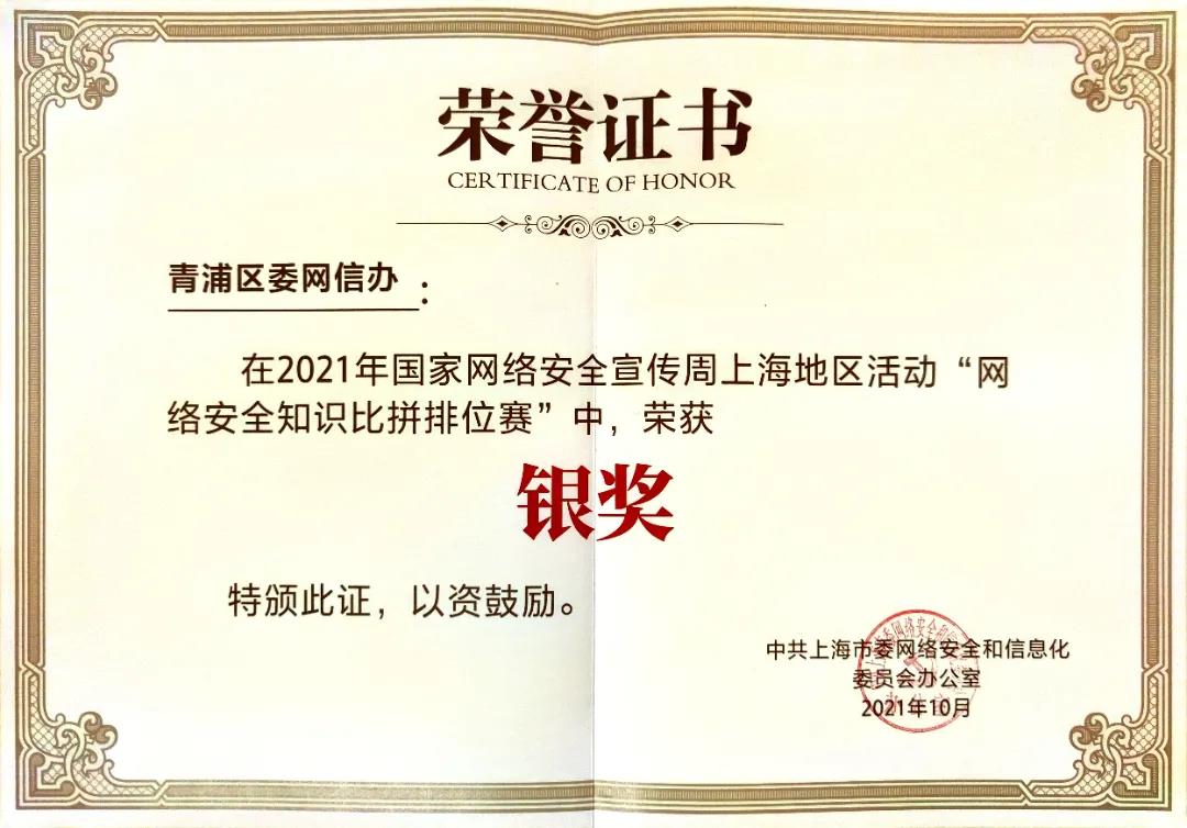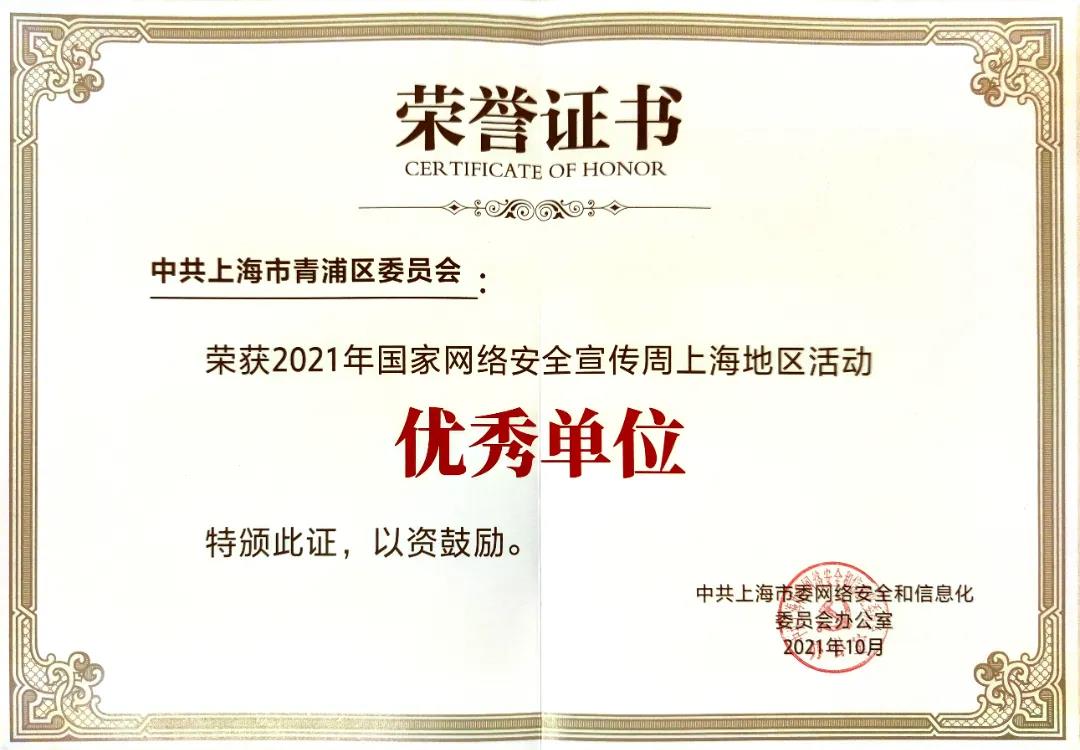 2021年青浦區網絡安全工作主要榮譽:中共青浦區委網信辦榮獲2021年度上海市網絡安全工作先進單位;中共青浦區委榮獲2021年國家網絡安全宣傳周上海地區活動優秀單位;中共青浦區委網信辦榮獲2021年網絡安全知識比拼排位賽上海地區銀獎等。