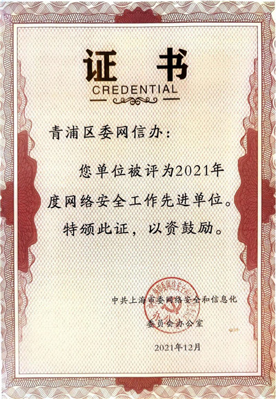 2021年是青浦實施“十四五”規劃、著力加快建設社會主義現代化國際大都市樞紐門戶的開局之年。青浦區網絡安全工作以習近平總書記網絡強國重要思想為指引,全面貫徹落實黨的十九屆六中全會和區第六次黨代會精神,不斷夯實工作基礎、健全工作機制、創新工作思路、豐富活動載體,扎實推動全區網絡安全各項工作積極有序開展。中共青浦區委網信辦榮獲2021年度上海市網絡安全工作先進單位。