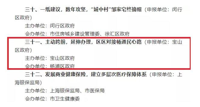近日,上海市建議提案辦理優秀案例名單揭曉,由寶山區政府主辦,楊浦區政府會辦的《主動跨前,延伸辦理,區區對接暢通民心路》獲評。
