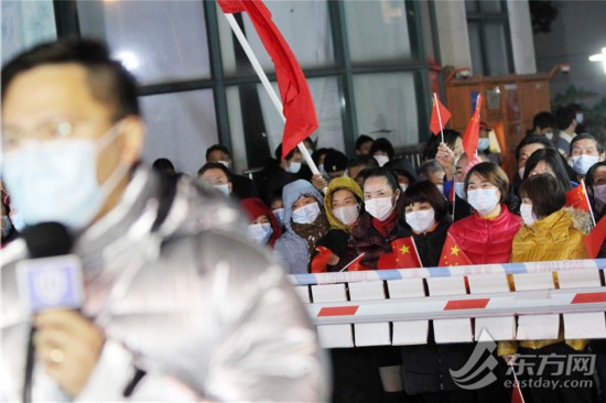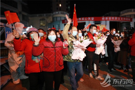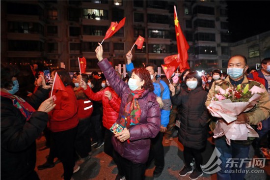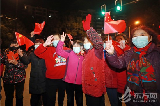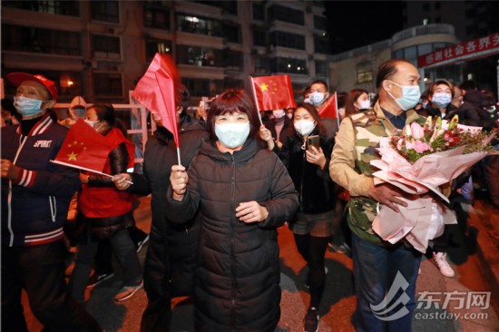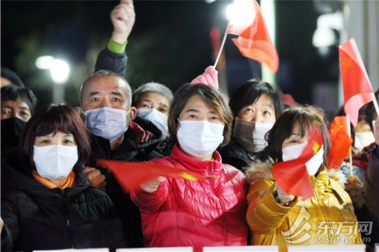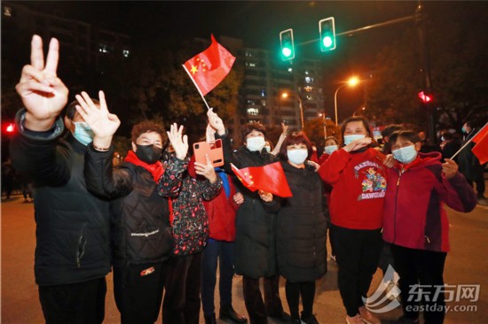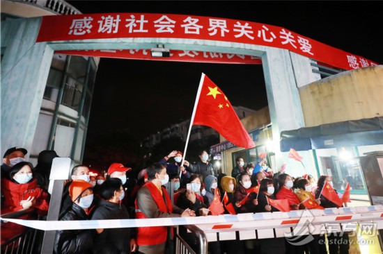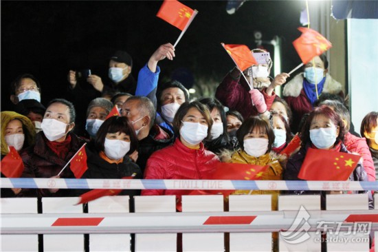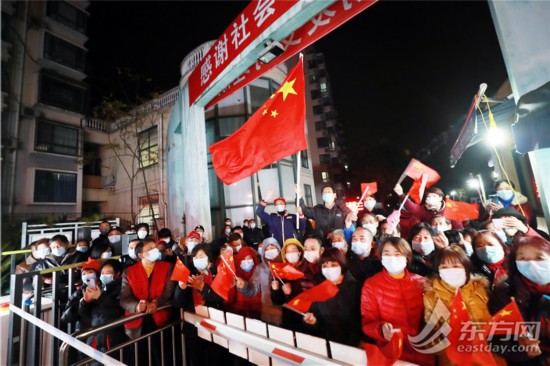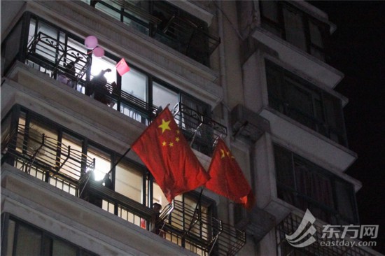 居民們揮舞著國旗,踏著零點,步出小區。