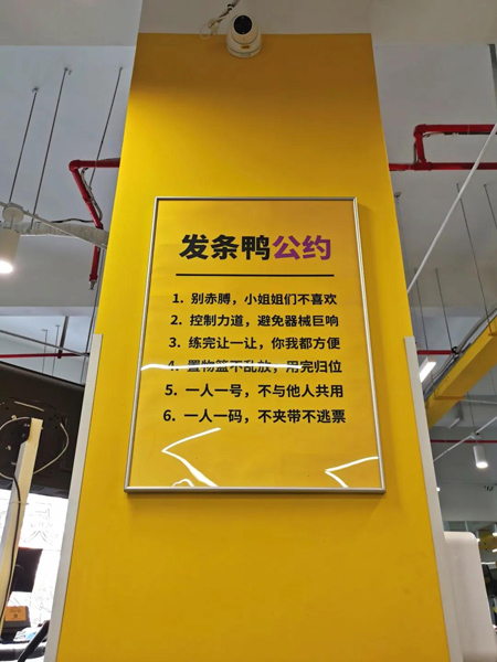 沿著婁山關路一路向北,在與云霧山路交叉口處的虹橋假日廣場二層,一間懸掛著亮眼黃色招牌,并且擁有一整面落地窗的新店著實吸引人眼球,這便是發條鴨24小時無人健身房。