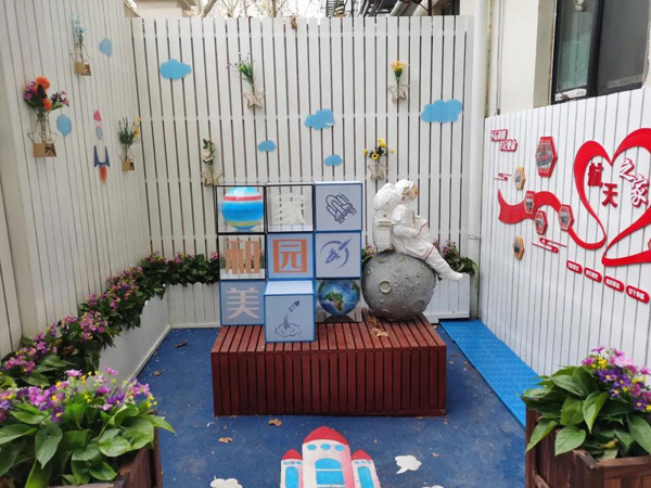 這兩天,路過愚園路1167號的人都會發現,除了電梯本身在愚園路上讓眼前一亮外,底樓電梯入口,也多出來一個漂亮的小花園,靚麗十足。電梯的左側,是一個花壇圍繞的四方形小院子:小院中央是一個休閑椅,一個“航天員”依靠在旁,好似帶著人們探索宇宙;圍墻上的星型花架、地上的升空火箭圖案等布置,讓整個小院充滿了航天氣息。而電梯的右側,有著更多的航天科普知識,墻上的科普展,記錄了從1980年到2021年我國航天發展的歷程;掃一掃左下方的二維碼,還可以了解更多關于中國航天的百科故事。