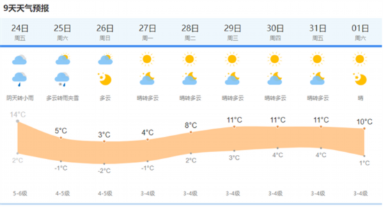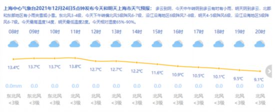 上海中心氣象臺2021年12月24日5點鐘發布今天和明天上海市天氣預報:多云到陰,今天中午轉陰到多云有時有小雨,明天陰到多云,北部和東部地區有小雨夾雪或小雪。東北風3-4級,今天下午轉偏北風5級陣風6-7級,沿江沿海地區6級陣風7-8級,明天4-5級陣風6級,沿江沿海地區5級陣風6-7級。今天最高溫度14度,明天最低溫度2度。