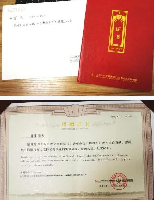 2021年12月22日,正在工作的陳雷醫生收到了來自上海歷史博物館的捐贈證書。