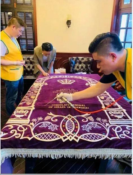 為此,曹立東帶領著自己的團隊,花費了兩天多的時間,調配了二十多款洗滌藥劑,才找到合適的洗滌方法。最終在耐心細致的操作下,將這件婚紗污漬清洗干凈,“文物級”婚紗煥然一新!跋赐旰,紀念館那邊很感謝我們的工作,通過視頻通話還給婚紗的主人看了,對方都感動的留下了眼淚!辈芰|說。不僅如此,另一個文物絲絨帶尼泊爾金絲和飾品的誦經掛毯,它是以色列駐中國大使館贈送給猶太難民紀念館的。最后,同樣被曹立東團隊清理干凈。