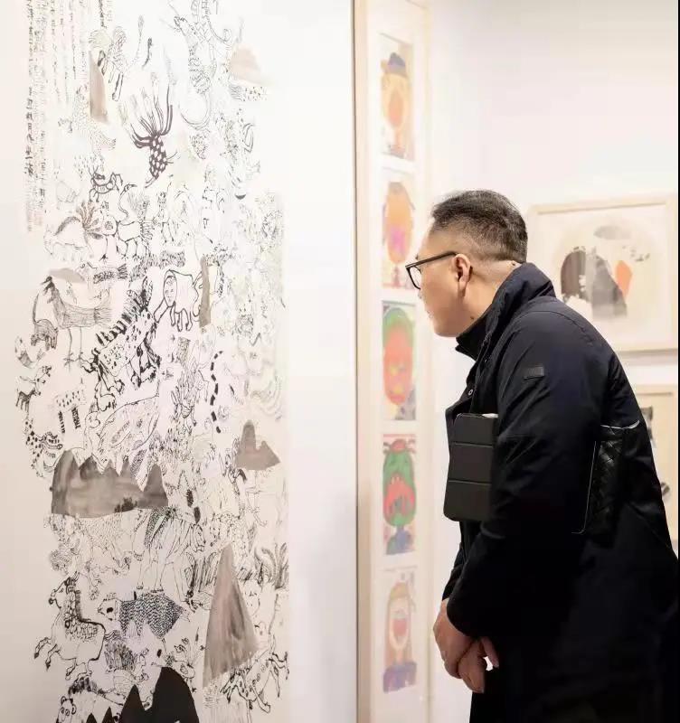 九尾狐、九頭鳥、旋龜、鳳凰……水墨畫《山海百靈》,是此次展覽中尺幅最大的作品。有深有淺、字跡不同且大小不一的題款,數十只畫風迥異的靈獸剪紙,讓參觀者會心一笑:顯然,這是一幅集體作品!八啥11)班的四十多名學生,在美術課上集體創作完成!敝笇Ю蠋熼熣垢嬖V小布,動物是小學低年級學生喜愛的創作元素,但《山海經》里的靈獸們,與現代生活里的動物還是非常不一樣的。孩子們通過課堂學習,先了解這些靈獸的奇特之處,然后選擇自己喜歡的畫下來,再用剪紙藝術的方式,粘貼匯集成一幅充滿個性又和諧的畫作。在這個過程中,學生既學習個性表達和獨立創作,也學會了如何集體合作。