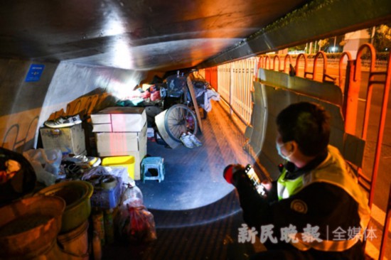 今冬首個強寒潮正在襲擊申城。在此之前,上海市、區兩級民政、公安、城管、衛健等部門已提前準備,全面啟動“氣象預警聯動機制”,開展針對流浪乞討等生活無著露宿街頭人員的“寒冬送溫暖”專項救助行動。在靜安區恒豐路近遠景路的一處橋洞下,記者目擊了民政、公安救助人員整整用了兩小時,終于將三位流浪人員勸說進入室內避寒。