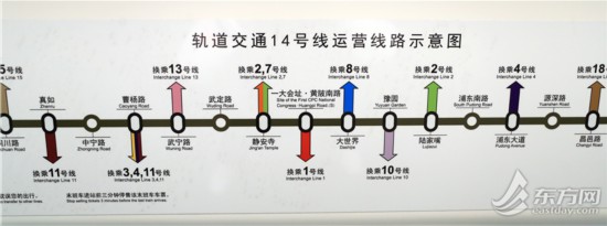 申通地鐵集團介紹,上海軌道交通14號線是一條城市東西方向的徑向線,西起嘉定區封浜站,東至浦東新區桂橋路站,沿線經過嘉定區、普陀區、靜安區、黃浦區、浦東新區等五個行政區,運營里程38公里,設站31座(本次開通30座),換乘站13座。