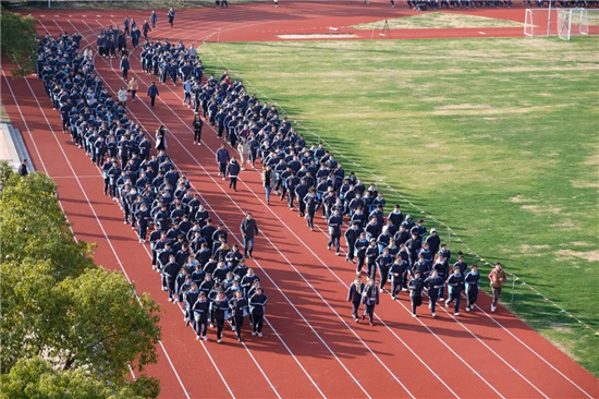 上午8點45分,第一節課的下課鈴聲剛剛打響,同濟大學第一附屬中學的1500余名師生走出教室,來到操場,按照班級進行整隊,開始每天的“課間健康跑”運動。動感的樂曲、整齊的隊列、有力的步伐……紅色跑道上,師生們跑步正酣,熱火朝天,一個個方陣展現出了師生們的青春活力。