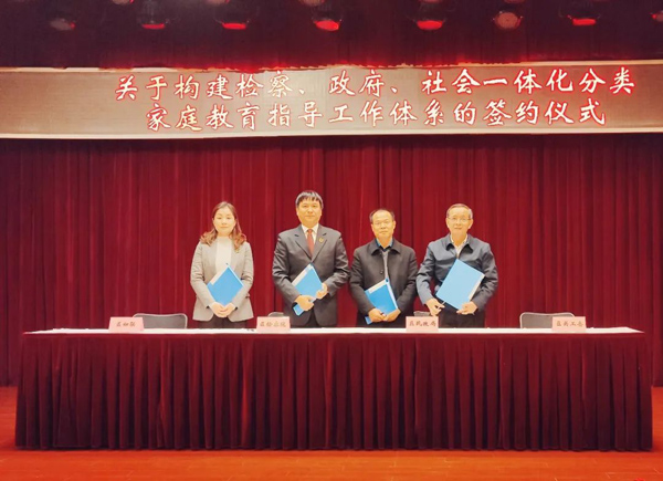 今天,區人民檢察院、區民政局、區婦女聯合會、區關心下一代工作委員會四方就《關于構建檢察、政府、社會一體化分類家庭教育指導工作體系的意見》(以下簡稱《意見》)舉行簽約儀式。
