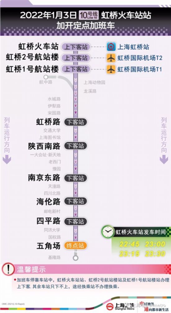 10號線虹橋火車站站往五角場站方向定點加班車,沿途僅?亢鐦蚧疖囌菊、虹橋2號航站樓站、虹橋1號航站樓站、虹橋路站、陜西南路站、南京東路站、海倫路站、四平路站、五角場站,其余車站跳停。?寇囌局,虹橋火車站站、虹橋2號航站樓站、虹橋1號航站樓站可上下客,其余車站只下不上,途經換乘站不可換乘。