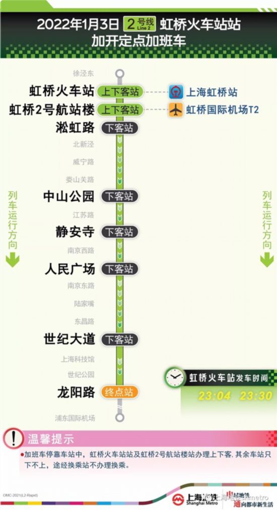 2號線定點加班車始發站虹橋火車站站,終點站龍陽路站,中途?亢鐦2號航站樓站、淞虹路站、中山公園站、靜安寺站、人民廣場站及世紀大道站。其中除始發站虹橋火車站站及虹橋2號航站樓站可上下客,其余各?空径贾荒芟驴,途經換乘站不可換乘。