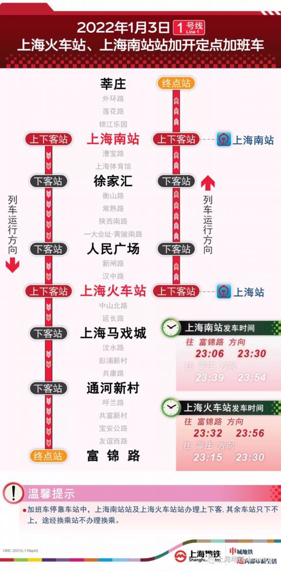 其中,1號線上海南站站往富錦路站方向定點加班車沿途僅?啃旒覅R站、人民廣場站、上;疖囌菊、上海馬戲城站、通河新村站、富錦路站,其余車站跳停。?寇囌局,上海南站站、上;疖囌菊究缮舷驴,其余車站只下不上,途經換乘站不可換乘。