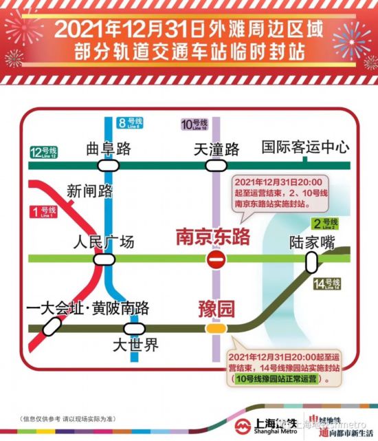根據交通管制要求,為配合做好市中心商業區域的客流疏導,2021年12月31日20:00起至運營結束,上海地鐵2號線、10號線南京東路站實施封站;14號線豫園站同步實施封站跳停(10號線豫園站正常運營)。封站期間,途經2、10號線南京東路站、14號線豫園的列車均不停站,車站不辦理進出站及換乘業務。屆時,車站將加強站內廣播宣傳、導向設置、站臺站廳秩序維護等工作。
