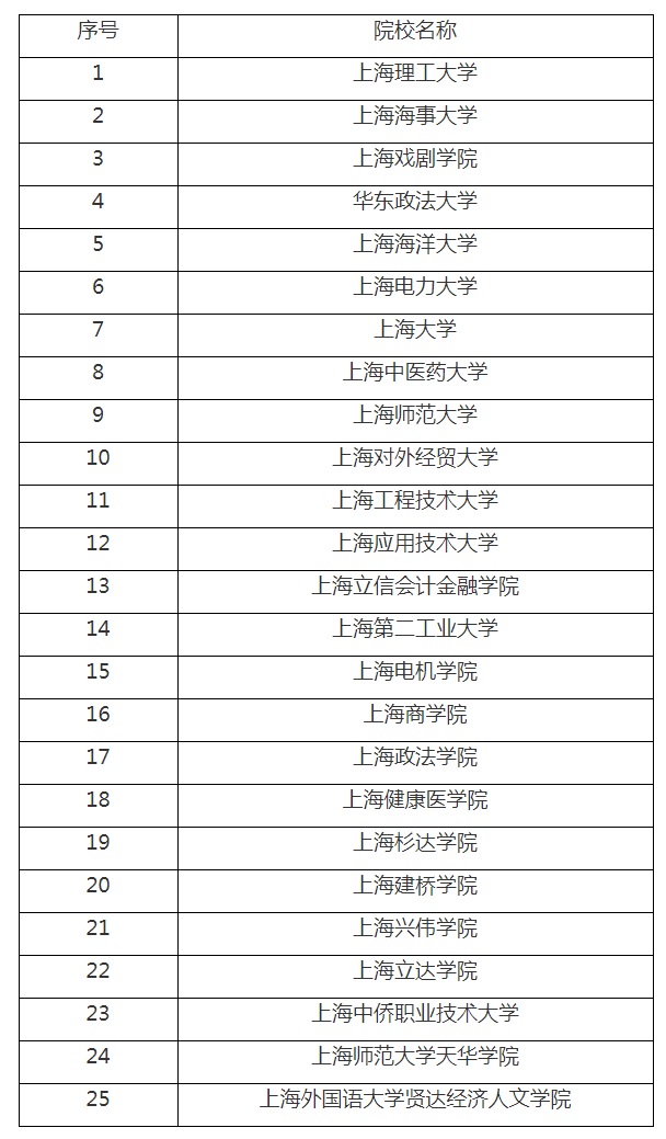 春季高考2000年在上海首批試點,今年招生院校已增至25校,招生計劃數也進一步增加,報考數接近4.5萬人,人數占到所有上海高考生的七成以上。根據相關規定,春考招生專業須是各校特色專業或應用型本科試點專業。今年參與試點招生的院校包括上海理工大學、上海海事大學、上海戲劇學院、華東政法大學、上海海洋大學、上海電力大學、上海大學、上海中醫藥大學、上海師范大學、上海對外經貿大學、上海工程技術大學、上海應用技術大學等25所院校。